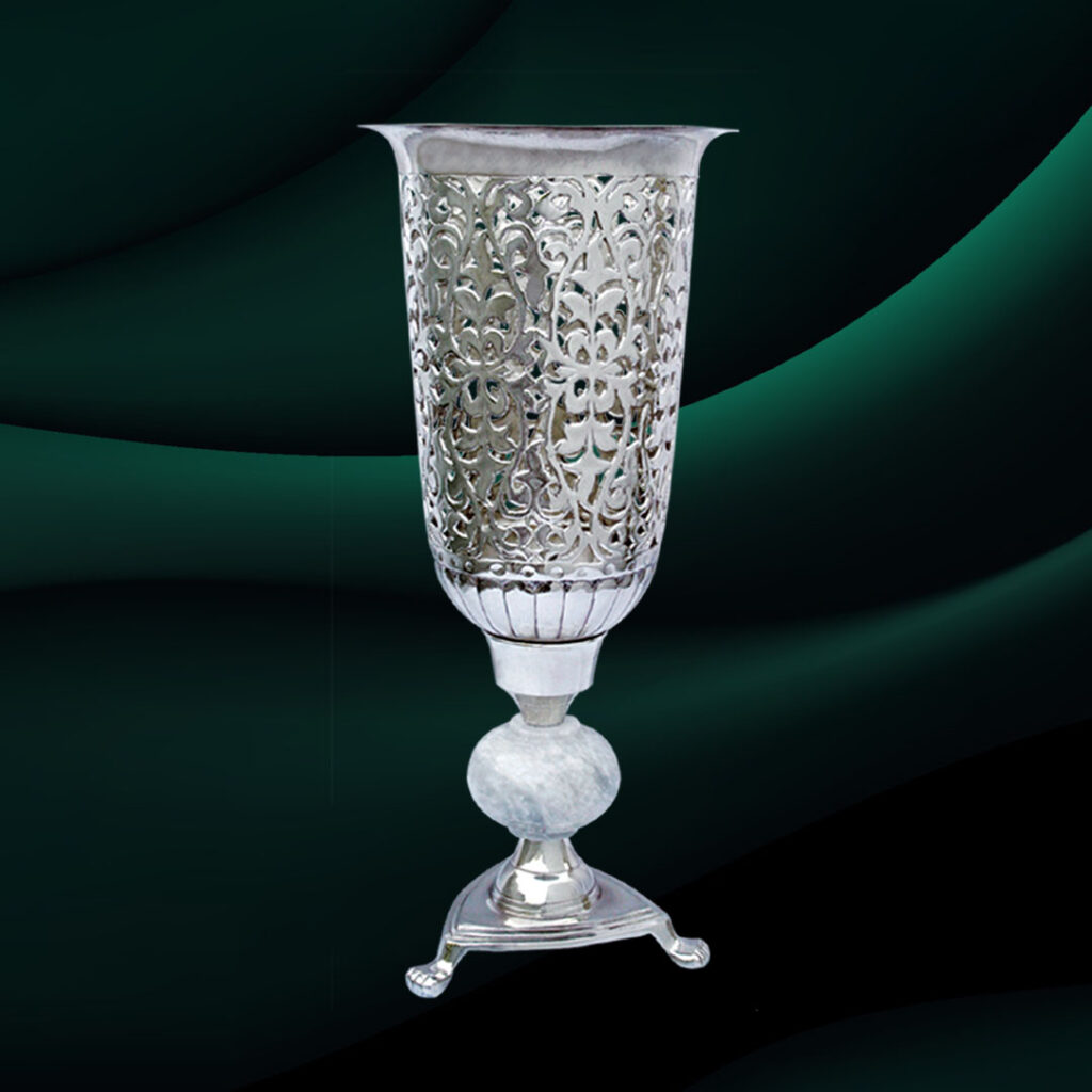 Its center features an intricate cutout motif, beautifully framed by a delicately hammered edge and intertwined leaf detailing. Polished semi-precious agate stones on either side add a refined touch of sophistication, transforming the tray into a statement of luxury.
