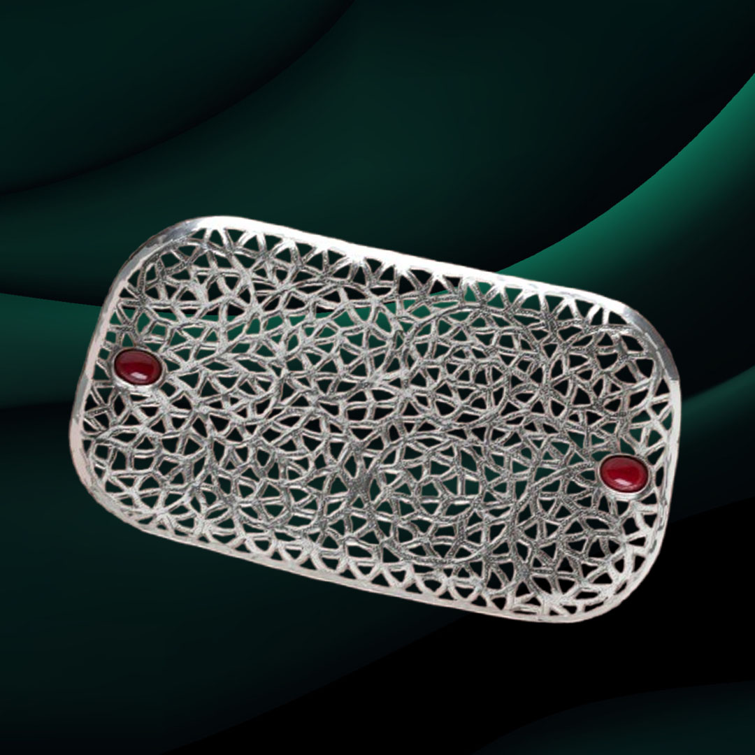 At TazeenoAraish, mastery in silversmithing is transformed into contemporary luxury through generations of artisanal expertise. The Irani Cutwork Tray Big is a distinguished example, meticulously handcrafted by Pakistani artisans to create a centerpiece of refined elegance.