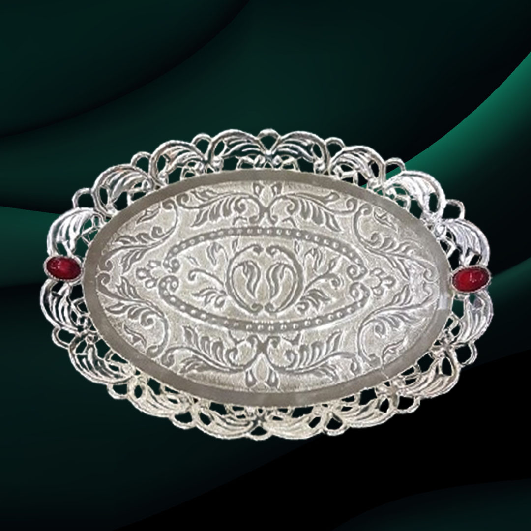 At TazeenoAraish, generations of Pakistani artisans channel their expertise and passion into the art of silversmithing, transforming raw materials into extraordinary works of art. The Oval Tray Stone is a testament to this mastery, meticulously handcrafted from premium solid brass and expertly silver-plated by hand.