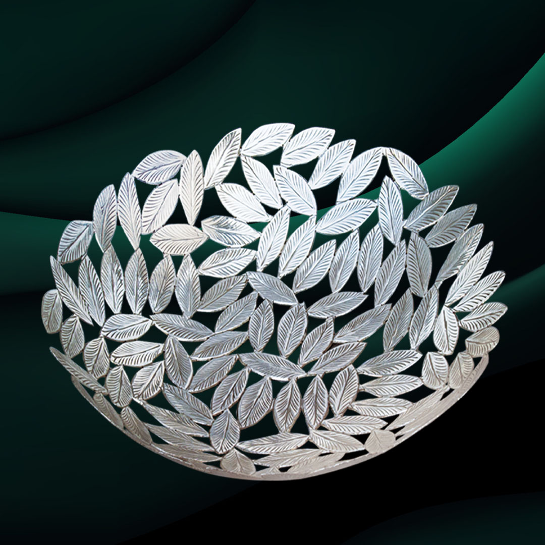 The Samarqand Bowl Big is meticulously crafted from high-quality solid brass and hand-finished with silver plating, resulting in a luminous, enduring surface. Its design, inspired by the organic intertwining of autumn leaves, is brought to life through precise detailing and exquisite cutout work, making each bowl a remarkable work of art.