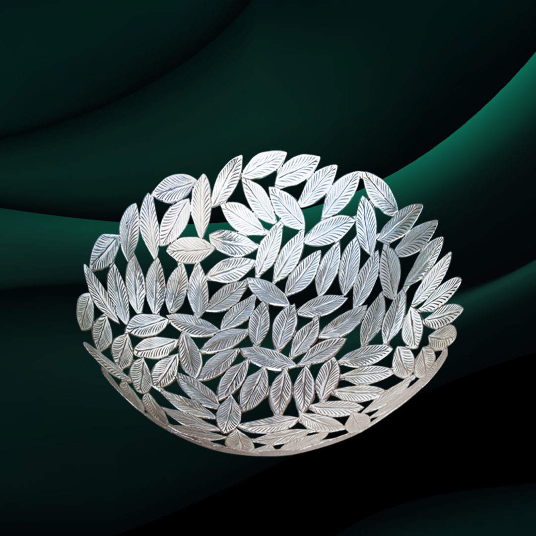 The Samarqand Bowl Medium is meticulously crafted from high-quality solid brass and hand-finished with silver plating, resulting in a luminous, enduring surface. Its design, inspired by the organic intertwining of autumn leaves, is brought to life through precise detailing and exquisite cutout work, making each bowl a remarkable work of art.