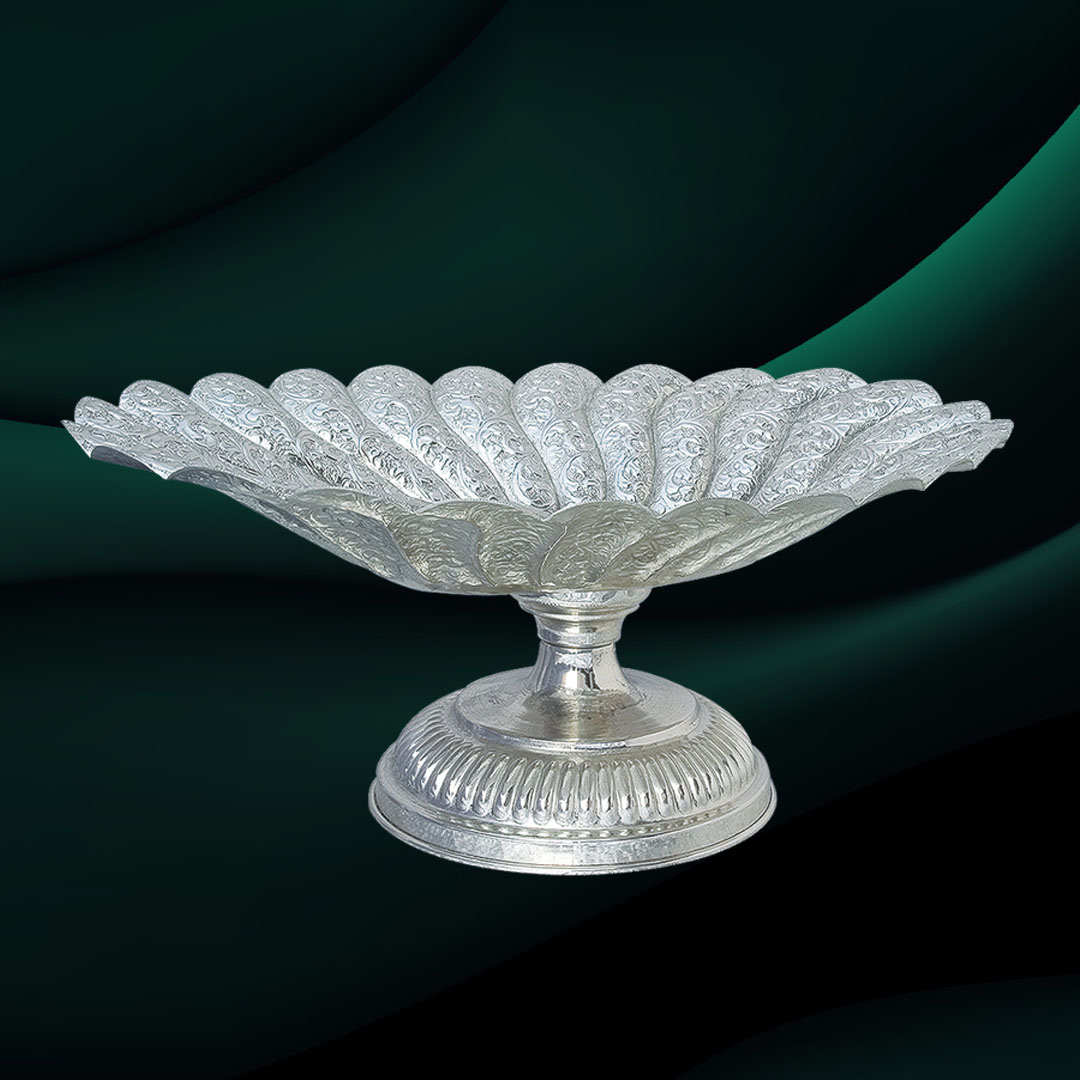 Exemplifying generations of exceptional silversmithing expertise, Pakistani artisans have meticulously crafted the Swirlled Fruit Platter, a striking statement piece that blends artistry with functionality. The elegantly rounded pedestal supports a uniquely shaped bowl, while intricate hand-applied silver hammering adds refined detailing and depth to the design.